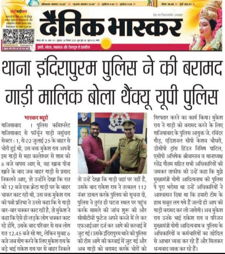 निरीक्षक रवेंद्र गौतम को इस सम्मान के लिए हार्दिक बधाई। उम्मीद है कि ‘इंदिरापुरम के सिंघम’ आगे भी इसी साहस, ईमानदारी और प्रतिबद्धता के साथ जनता की सुरक्षा करते रहेंगे।